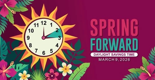 On March 8th 2026 don't forget to change your clocks 1 hour ahead. Enjoy a little more sunshine in the afternoon and evening with later sunsets.
